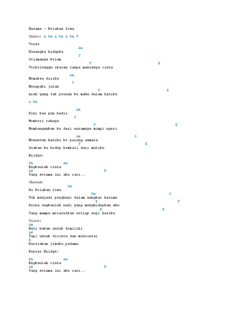 Hazama - Relakan Jiwa Chord. Ziana Zain dan Hazama Azmi The Penglipurlara. Relakan Jiwa x Madah Berhelah Dayang Nurfaizah dan Kugiran Hujan.